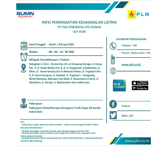 “Dengan adanya pemadaman tersebut, maka PT. PLN (Persero) ULP Duri mohon maaf atas ketidaknyamanan dan terganggunya aktifitas pelanggan, mohon doa dan dukungannya agar oemeliharaan berjalan lancar. Atas perhatian dan kerja samanya kami ucapkan terima kasih,” pungkasnya.*Bres