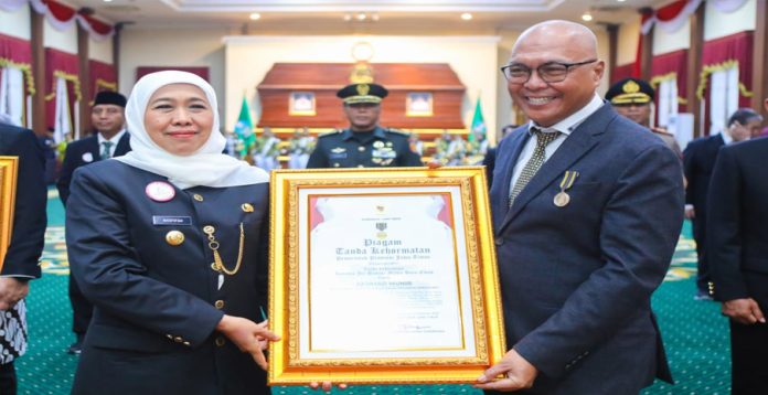 CENTRALNEWS.ID, SURABAYA Ketua Umum Persatuan Wartawan Indonesia (PWI) Pusat, Akhmad Munir, menerima Lencana Kehormatan Provinsi Jawa Timur “Jer Basuki Mawa Beyadari Gubernur Jawa Timur dalam acara puncak Hari Jadi ke-80 Provinsi Jawa Timur, yang berlangsung di Gedung Negara Grahadi, Surabaya, Minggu (12/10/2025).