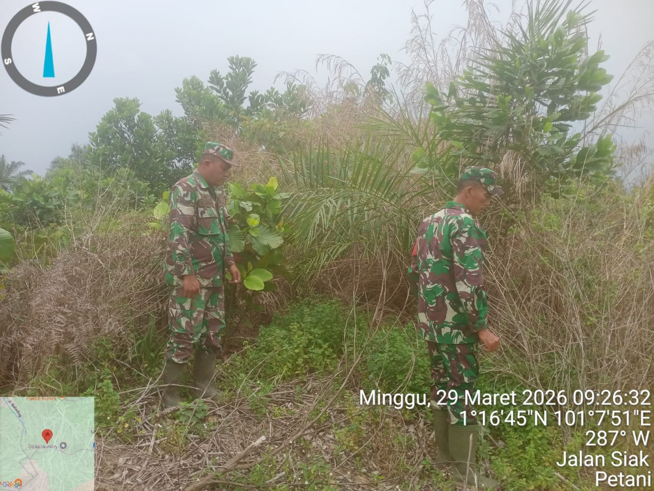 CENTRALNEWS.ID, DURI – Sebagai upaya mencegah terjadinya kebakaran hutan dan lahan (Karhutla) Prajurit Koramil 03 Mandau Sertu Sutiman dan Serda Ahmad Junaidi laksanakan instruksi Danramil 03 Mandau Kapten Czi. Suratmin untuk berpatroli di jalan Siak desa Petani, kecamatan Bathin Solapan, Minggu (29/3).