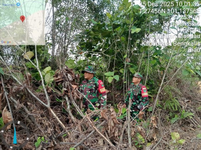 CENTRALNEWS.ID, DURI – Sebagai upaya mencegah terjadinya kebakaran hutan dan lahan (Karhutla) Prajurit Koramil 03 Mandau Sertu Awaludin, Serda Z. Panjaitan dan Kopda P. Samosir laksanakan instruksi Danramil 03 Mandau Kapten Czi. Suratmin untuk berpatroli di kelurahan Pematang Pudu, kecamatan Mandau, Kamis (25/12).