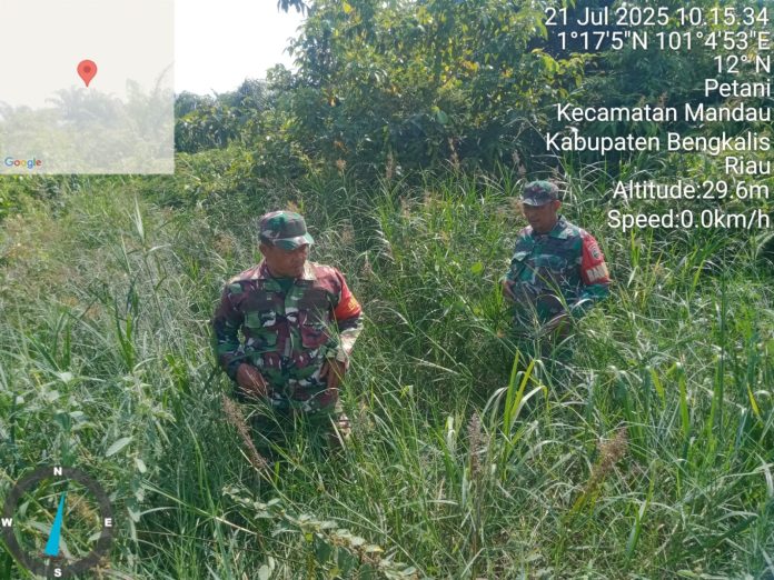 CENTRALNEWS.ID, DURI – Sebagai upaya mencegah terjadinya kebakaran hutan dan lahan (Karhutla) Prajurit Koramil 03 Mandau Serka N. Saragih, Serda Paino dan Pratu Kifron laksanakan instruksi Danramil 03 Mandau Kapten Czi. Suratmin untuk berpatroli di desa Petani, kecamatan Bathin Solapan, Senin (21/7).