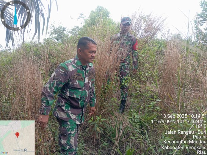 CENTRALNEWS.ID, DURI – Sebagai upaya mencegah terjadinya kebakaran hutan dan lahan (Karhutla) Prajurit Koramil 03 Mandau Serka Fauzi, Serda Riza Ramdani dan Pratu Indro K. Sinaga laksanakan instruksi Danramil 03 Mandau Kapten Czi. Suratmin untuk berpatroli di jalan Rangau – Desa Petani, kecamatan Bathin Solapan, Sabtu (13/9).