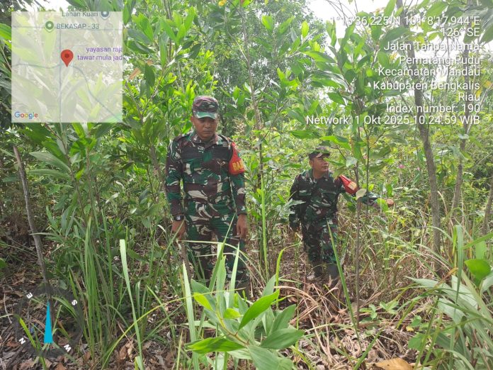 CENTRALNEWS.ID, DURI – Sebagai upaya mencegah terjadinya kebakaran hutan dan lahan (Karhutla) Prajurit Koramil 03 Mandau Sertu Joni R, Sertu AT Silaban dan Serda Zulkarnain laksanakan instruksi Danramil 03 Mandau Kapten Czi. Suratmin untuk berpatroli di kelurahan Pematang Pudu, kecamatan Mandau, Rabu (1/10).