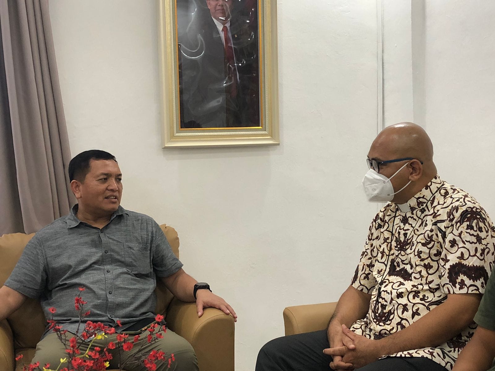 CENTRAL BATAM.CO.ID, Batam, Kabinda Kepri, Bonar Panjaitan menjalin silaturahmi bersama Ketua Komisi Keadilan Pastoral Migran dan Perantau (KKPPMP) Keuskupan Pangkalpinang, Romo Chrisanctus Paschalis Saturnus, Sabtu (06/05/2023). Hal ini dilakukan meningkatkan sinergitas dalam mendukung penanganan tindak pidana perdagangan orang (TPPO) di wilayah Provinsi Kepri.