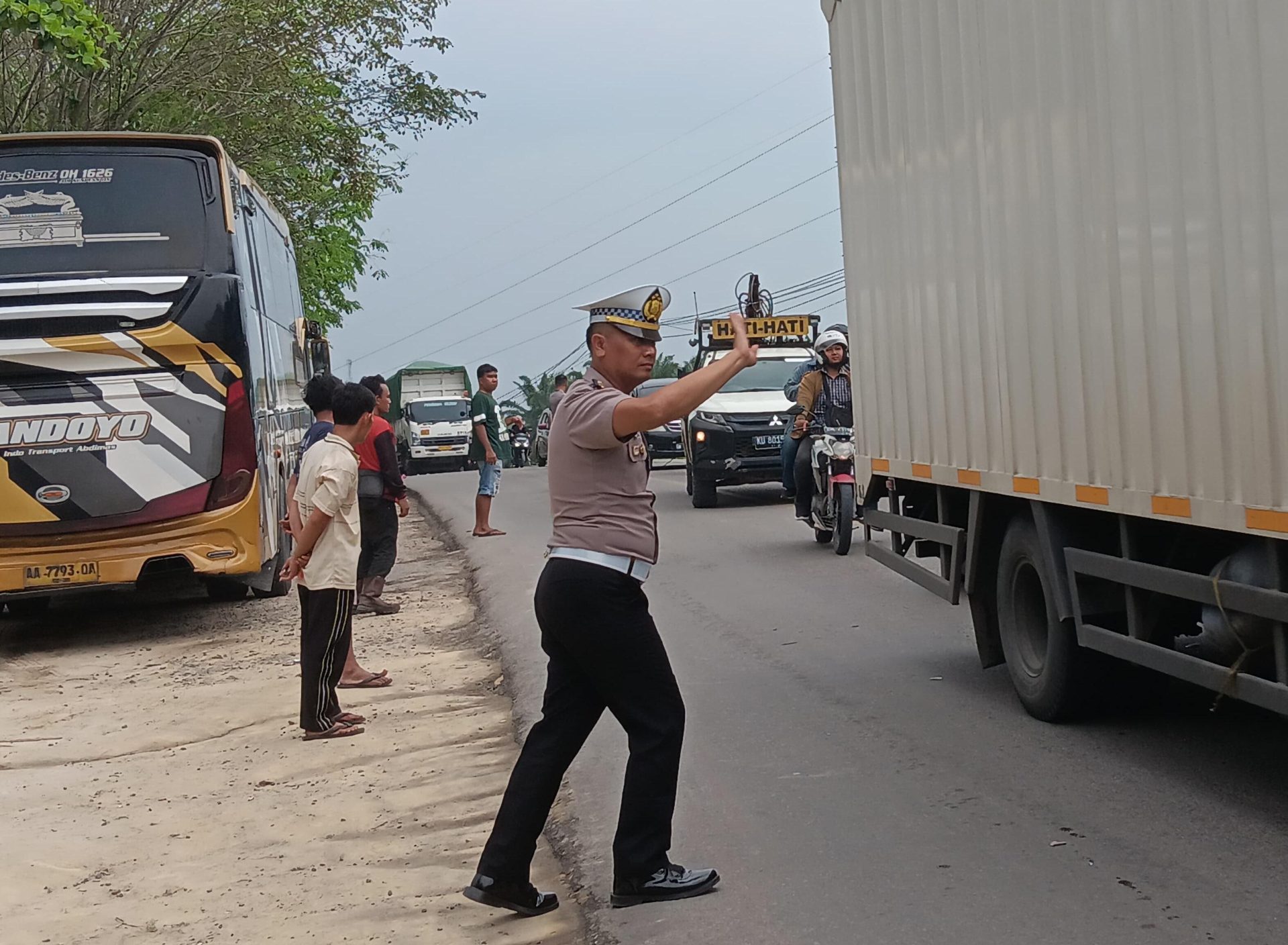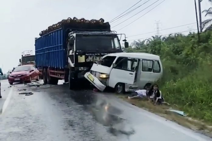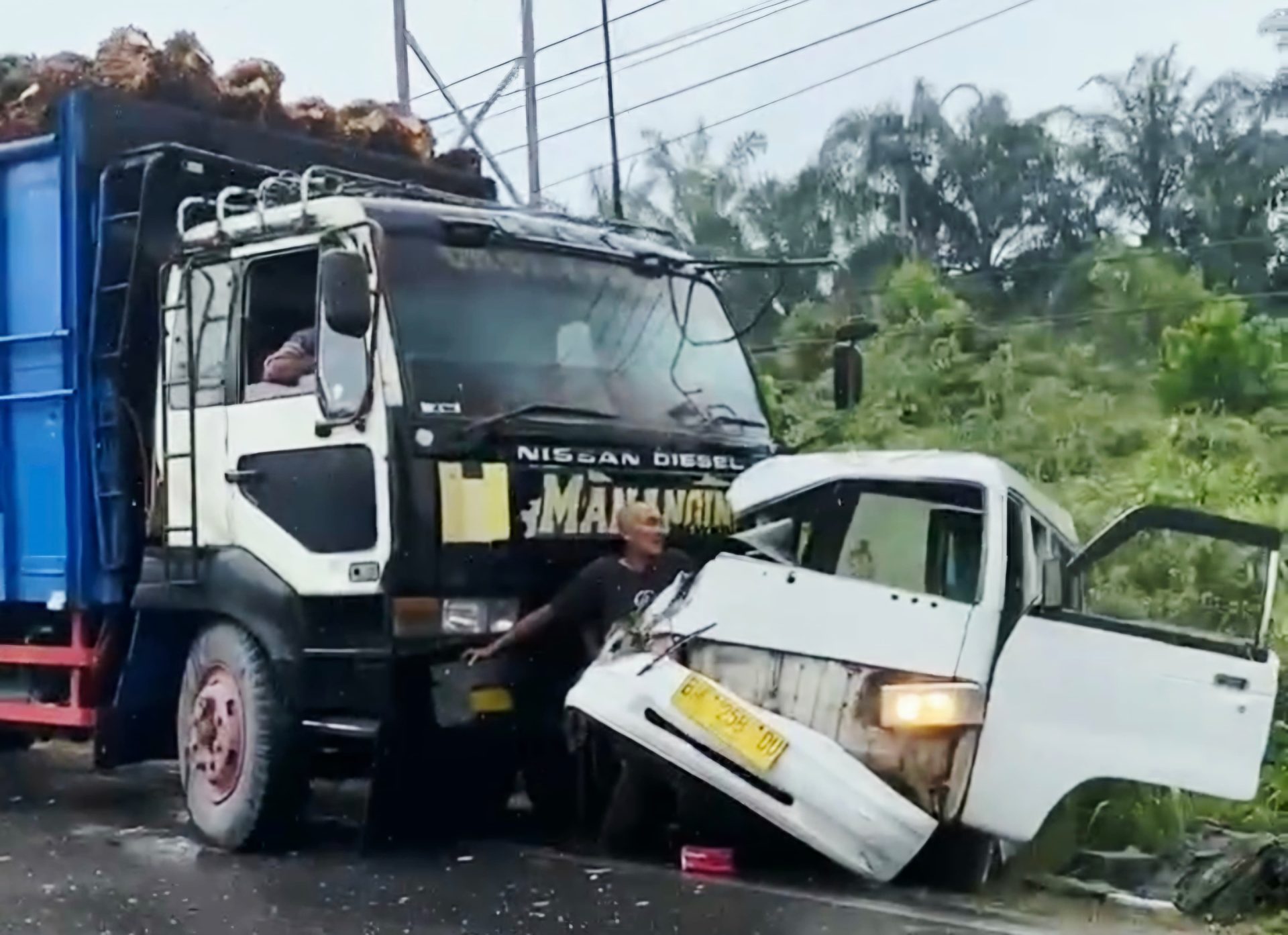 Kejadian nahas tersebut melibatkan tiga unit kendaraan yakni satu unit Bus AKAP Handoyo AA 7793 OA, satu unit Angkot Penumpang BM 1258 DU dan satu unit Tronton BK 8845 YI bermuatan penuh tandan buah kelapa sawit.