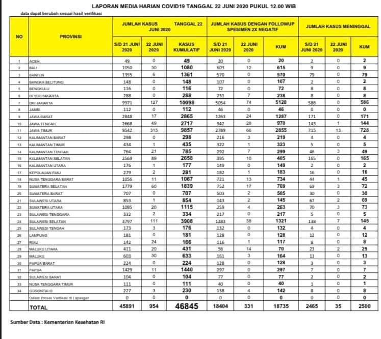Untuk kasus nasional terkonfirmasi positif Covid-19 per hari ini mencapai 954 kasus. Total atau akumulasi kasus Covid-19 di Indonesia atas penambahan jumlah kasus hari ini pun berjumlah 46.845 kasus positif, untuk pasien sembuh mencapai 18.735 orang dan korban jangkitan Covid-19 yang meninggal mencapai 2.500 jiwa.
