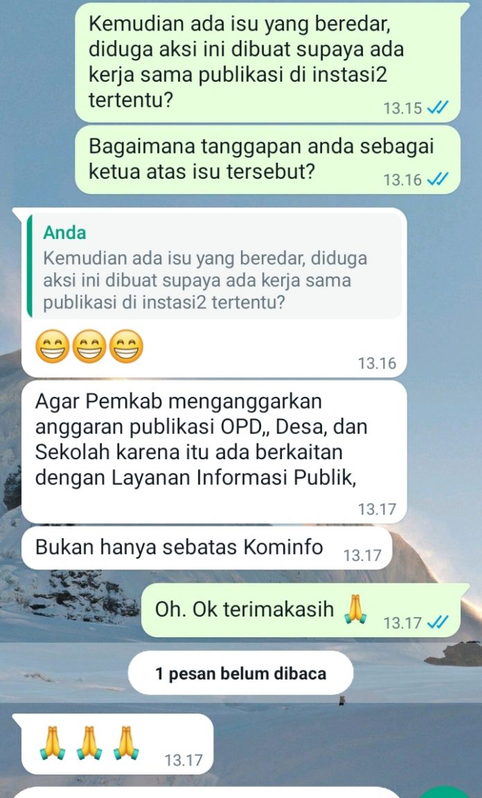 “Agar Pemkab menganggarkan anggaran publikasi OPD,, Desa, dan Sekolah karena itu ada berkaitan dengan Layanan Informasi Publik,” jawab E tidak membantah isu yang beredar saat dikonfirmasi, Rabu (15/6).