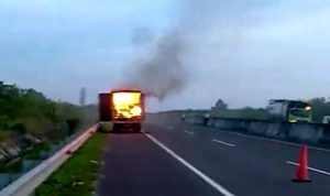Dilaporkan, satu unit truck box merek Mitsubishi Colt Diessel diduga bermuatan Baterai terbakar di kilometer 60 Tol Permai Rabu petang. Kobaran api tampak galak dan bikin pemandangan di jalan tersebut padat merayap.