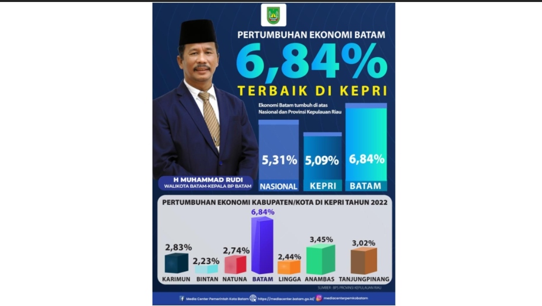 Sesuai data Badan Pusat Statistik (BPS) Kota Batam, ekonomi Batam tumbuh 6,84 persen pada 2022.