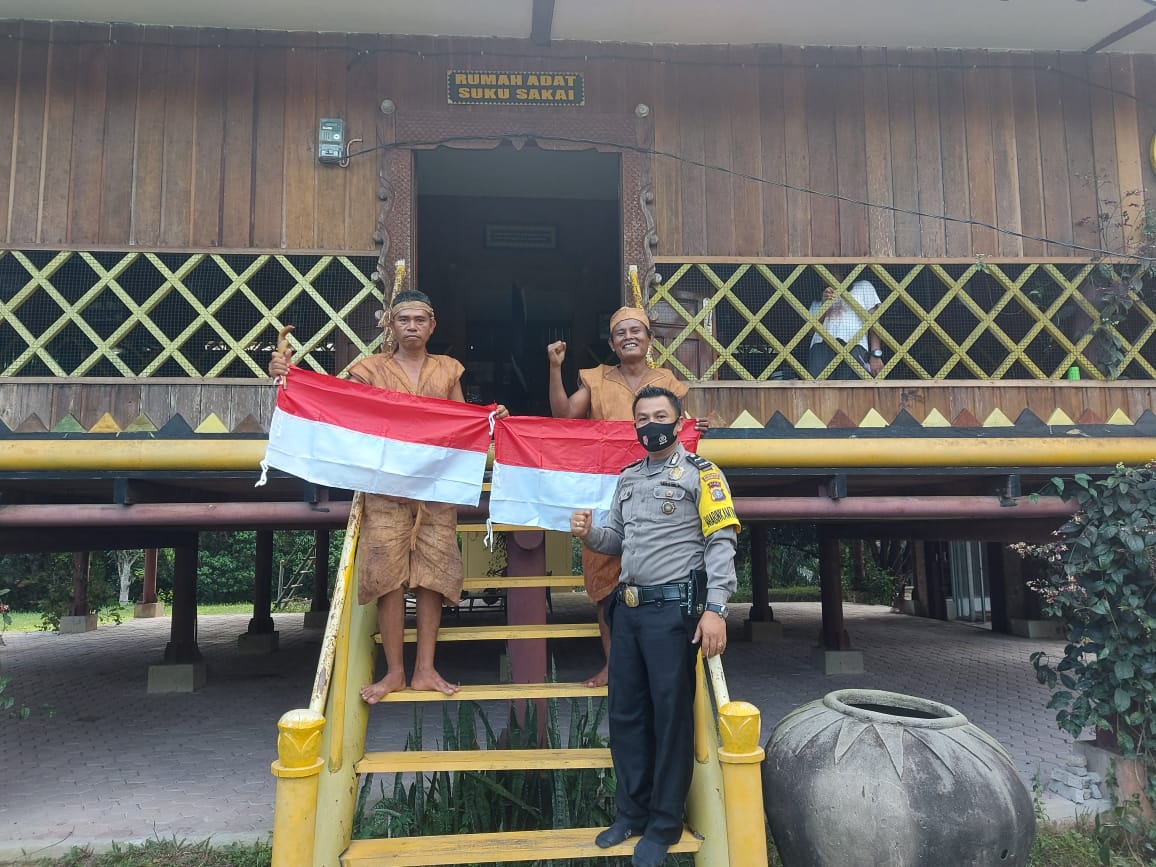 Lembaran bendera pun dibagikan dan diterima langsung dengan penuh suka cita oleh Kepala Adat Suku Sakai, Datuk Iyo Bangso M. Nasir. Seluruh masyarakat suku asli Riau di lokasi itu pun tampak riang dengan aksi sang petugas.
