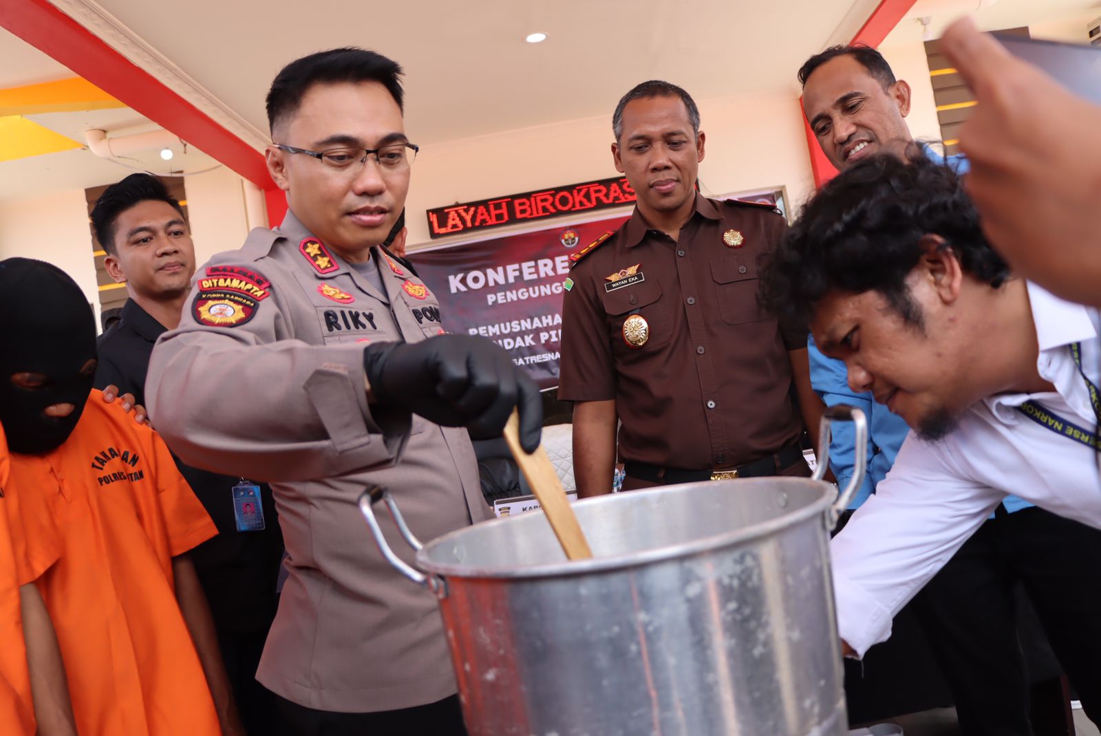 Pemusnahan tersebut dipimpin oleh Kapolres Bintan AKBP Riky Iswoyo didampingi Kasat Narkoba, Iptu Sofyan dan Kasi Humas Iptu Also. Selain itu, Kajari Bintan, I Wayan Eka Widdyara dan Hakim Pengadilan Negeri kelas IA Tanjung Pinang dan kuasa hukum para tersangka juga hadir.