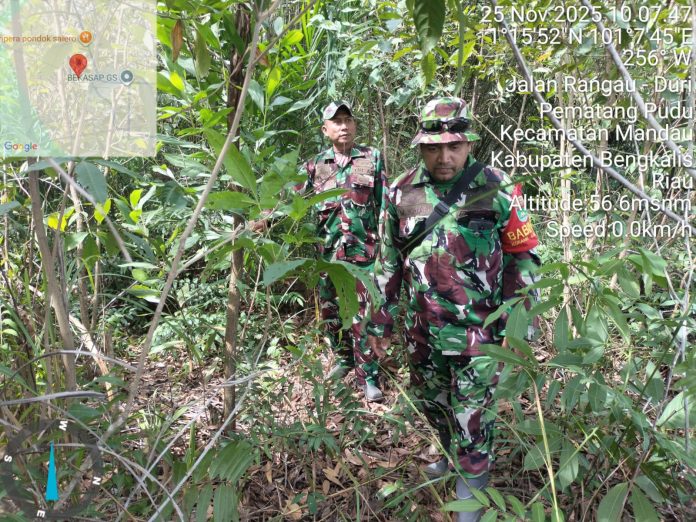 CENTRALNEWS.ID, DURI – Sebagai upaya mencegah terjadinya kebakaran hutan dan lahan (Karhutla) Prajurit Koramil 03 Mandau Sertu AT. Silaban, Koptu Muchsin Khan dan Kopda Yusup AW laksanakan instruksi Danramil 03 Mandau Kapten Czi. Suratmin untuk berpatroli di kelurahan Pematang Pudu, kecamatan Mandau, Selasa (25/11).