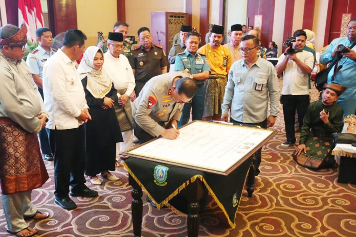 Kapolda Kepri Irjen Polisi Drs. Yan Fitri Halimansyah, M.H., bersama sejumlah pejabat, tokoh dan pemangku kepentingan saat deklarasi Pilkada Damai Provinsi Kepri 2024 di aula Wan Seri Beni kantor Gubernur Kepulauan Riau, Dompak, Jumat (20/9/2024)