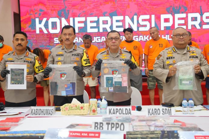 “Kasus ini melibatkan 25 tersangka dengan modus pengurusan dokumen palsu dan pengiriman melalui pelabuhan tikus. Pelaku dijerat UU Nomor 21 tahun 2007 tentang pemberantasan TPPO, ancaman 15 tahun,” ujar Kapolda Kepri Irjen Polisi Drs. Yan Fitri Halimansyah, M.H.