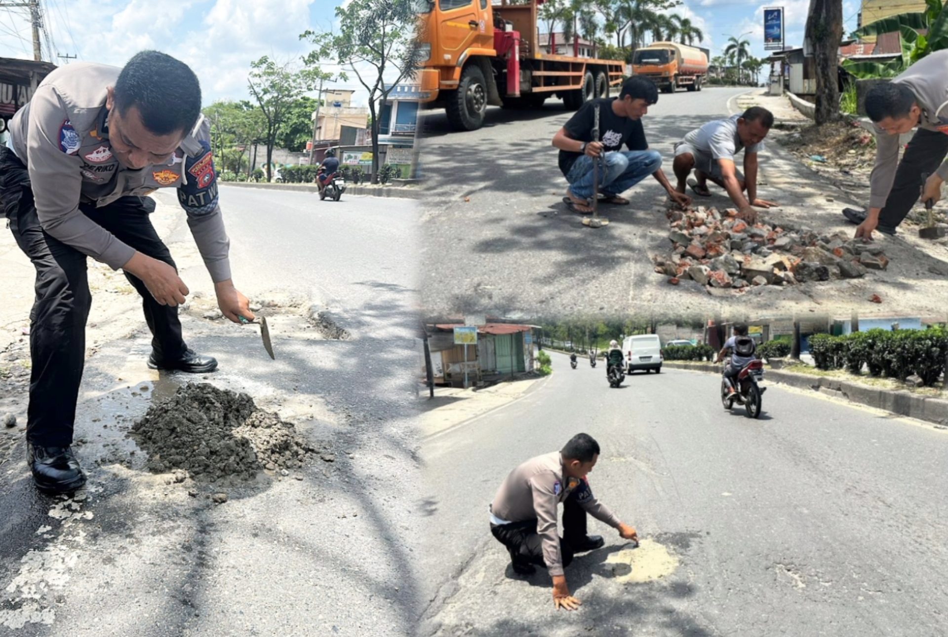 Kapos Lantas Pokok Jengkol Sigap Tambal Sejumlah Lubang Menganga di Jalan Hangtuah