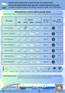 CENTRALBATAM.CO.ID, BATAM – Badan Meteorologi Klimatologi dan Geofisika (BMKG) Stasiun Meteorologi Kelas I Hang Nadim Batam merilis prakiraan cuaca untuk wilayah Kepulauan Riau (Kepri) yang berlaku mulai Rabu, 3 Desember 2025 pukul 07.00 WIB hingga Kamis, 4 Desember 2025 pukul 07.00 WIB.