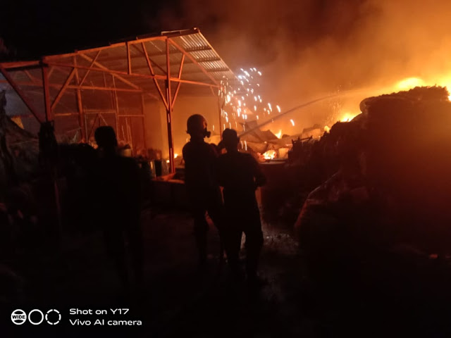 Kobaran api tampak menggagahi sebuah gudang atau tempat penyimpanan besi yang berada di jalan Tegal Sari, Kilometer 4 Kulim, RT004/RW003, Desa Pematang Obo, Kecamatan Bathin Solapan, Duri.