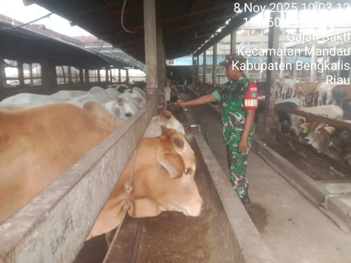 CENTRALNEWS.ID, DURI – Danramil 03 Mandau, Kapten Czi. Suratmin diwakili Babinsa Kopda Yudup tajak patroli kewilayahan untuk meninjau kesehatan hewan ternak jenis sapi sebanyak 60 ekor milik saudara Syaiful di kelurahan Gajah Sakti, kecamatan Mandau, Bengkalis – Riau, Sabtu (8/11).