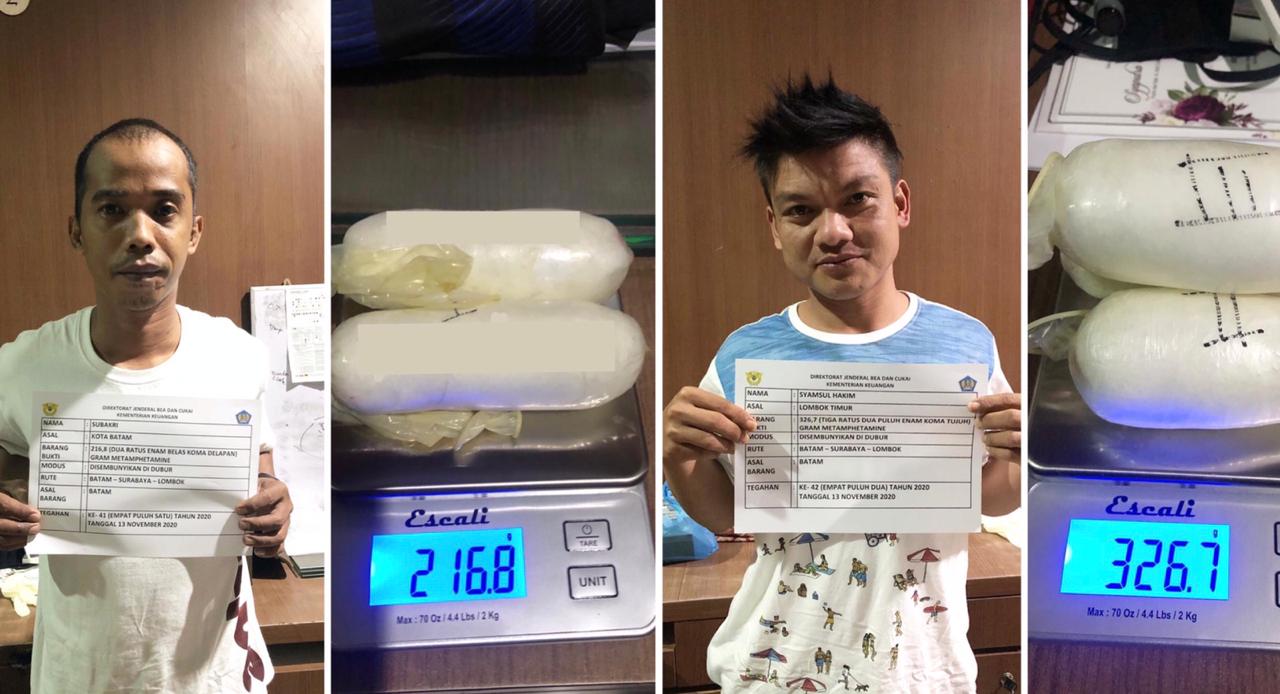 BC Batam amankan dua pria membawa sabu. Sabu seberat 216,8 gram dan 326,7 gram, masing-masing disembunyikan di dalam dubur dua orang pria inisial S (40) dan SH (27) calon penumpang pesawat dengan rute perjalanan Batam-Surabaya-Lombok.