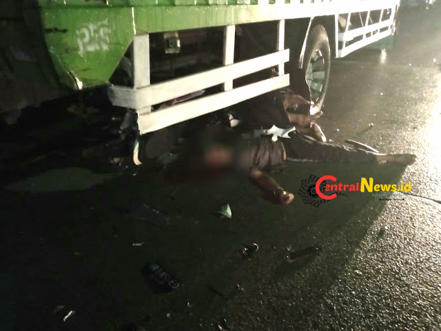 Tragedi nahas dalam berlalu lintas ini dilaporkan terjadi sekira pukul 23.00 WIB. Di lokasi, terlihat dua pria dan satu unit sepeda motor tampak mengenaskan di kolong truk.