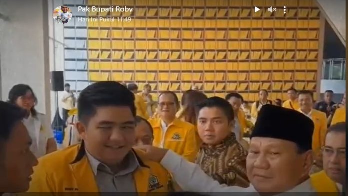 Ya, itu lah mimik Presiden RI ke 8, Prabowo Subianto saat memegang bahu Bupati Bintan Roby Kurniawan.