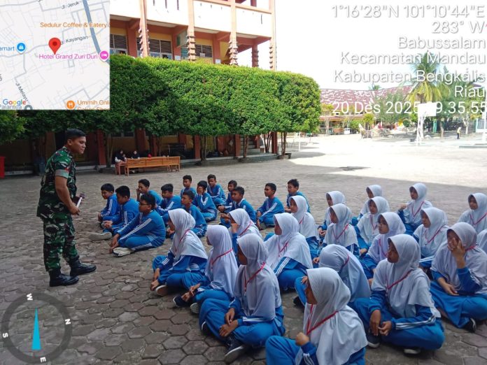 CENTRALNEWS.ID, DURI – Bertempat di lingkungan kelurahan Babussalam, Kecamatan Mandau – Duri, Danramil 03 Mandau Kapten Czi. Suratmin diwakili Babinsa Praka Amser Manullang pupuk semangat nasionalisme dan suluhkan wawasan kebangsaan, serta pengamalan butir-butir Pancasila di kalangan Anak-anak dan pelajar di SMP N 9 Mandau, Sabtu (20/12).