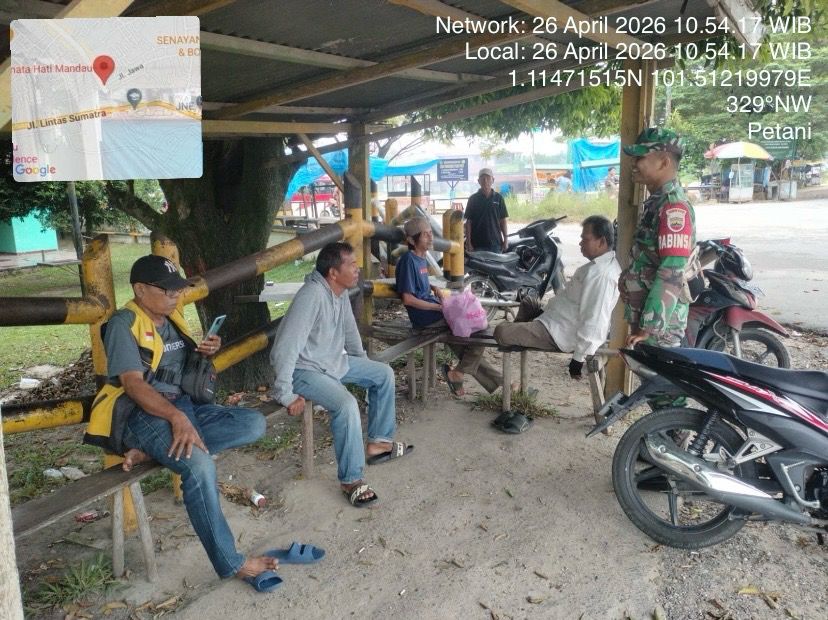 CENTRALNEWS.ID, DURI – Danramil 03 Mandau, Kapten Czi. Suratmin diwakili Babinsa Praka Indro K tajak komunikasi sosial bareng warga binaan di wilayah desa Petani, kecamatan Bathin Solapan dalam rangka menyuluhkan semangat kebangsaan serta pengamalan nilai luhur Pancasila, Minggu (26/4).