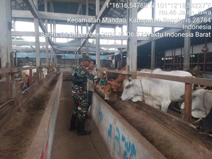 CENTRALNEWS.ID, DURI – Danramil 03 Mandau, Kapten Czi. Suratmin diwakili Babinsa Pratu Daniel Simanungkalit tajak patroli kewilayahan untuk meninjau kesehatan hewan ternak jenis sapi sebanyak 110 ekor milik saudara Rahmat di kecamatan Mandau, Bengkalis – Riau, Sabtu (6/12).