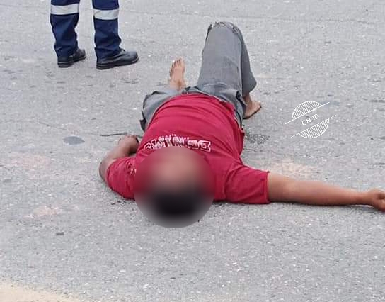 Dalam peristiwa nahas itu, diketahui seorang pria mengenakan kaos berwarna merah dan celana panjang berwarna abu-abu gelap tampak terkapar di tengah jalan.