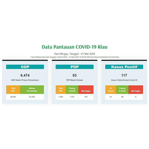 Hingga pukul 16.00 WIB data Kementerian Kesehatan (Kemenkes) RI yang dilansir dari laman resminya menampilkan bahwa Riau nihil penambahan kasus.