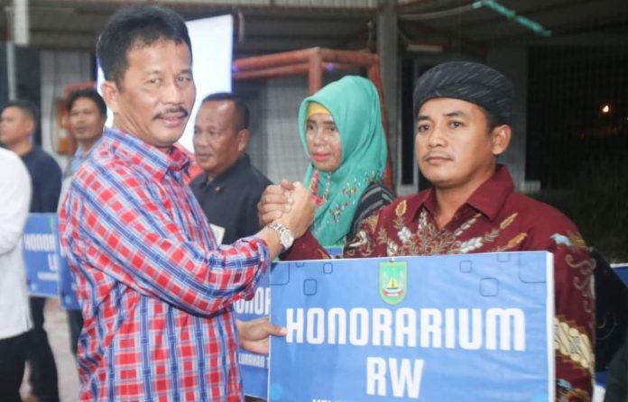 Wali Kota Batam Muhammad Rudi menyerahkan seraca simbolis honorium RW dalam silahturahmi di Seibeduk, Rabu (12/10/2022)