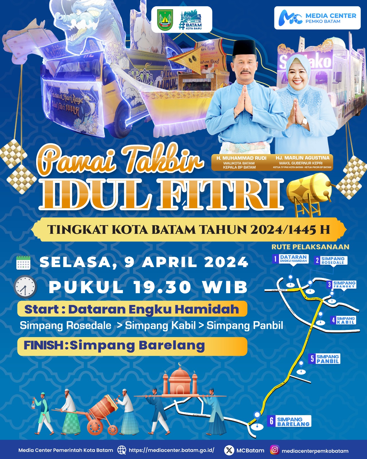 CENTRALNEWS.ID, BATAM – Pemerintah Kota (Pemko) Batam akan menggelar Pawai Takbir Keliling untuk memeriahkan malam penyambutan Idul Fitri 1445 Hijriah.