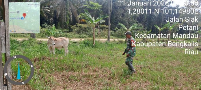 CENTRALNEWS.ID, DURI – Danramil 03 Mandau, Kapten Czi. Suratmin diwakili Babinsa Sertu Joni Rafdhal tajak patroli kewilayahan untuk meninjau kesehatan hewan ternak jenis sapi sebanyak 4 ekor milik saudara Anto di jalan Siak, kecamatan Bathin Solapan, Bengkalis – Riau, Minggu (11/1).