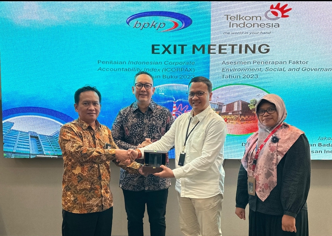 Exit meeting untuk penilaian berlangsung pada September 2024 lalu, yang juga menandai selesainya proses evaluasi tersebut. Turut hadir Direktur Pengawasan Badan Usaha Konektivitas, Pariwisata, Kawasan Industri, dan Perumahan BPKP Yunaedi, Koordinator Pengawasan Kawasan Industri dan Perumahan BPKP Joko Sutrisno selaku Ketua Tim Assessment, SVP Group Sustainability and Corporate Communication Telkom Ahmad Reza, VP Sustainability Telkom Gunawan Wasisto, dan PGS SVP Risk Management Telkom Rini Fitriani.