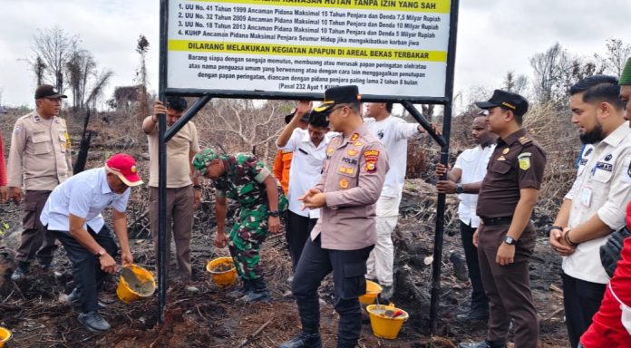 “Pemasangan plang ini digagas sebagai peringatan agar tidak ada yang mengelola lahan bekas terbakar, karena masih dalam proses penegakan hukum oleh Kepolisian dan instansi terkait. Hal ini juga dilakukan sebagai peringatan kepada seluruh masyarakat agar tidak melakukan pembukaan lahan dengan cara dibakar. Dan hari ini kita hadir sebagai wujud sinergitas dan kekompakan lintas sektoral dalam menjaga keamanan di masyarakat serta menjaga kelestarian lingkungan,” kata Kapten Czi. Suratmin. (Bres)