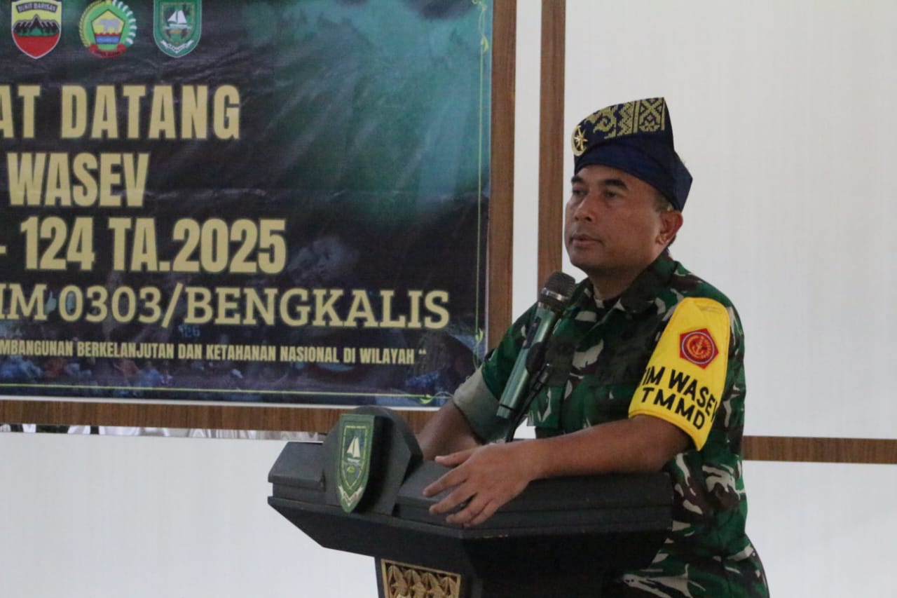 Wujud kebanggaan masyarakat sambut kedatangan Ketua Tim Wasev, Brigjend. Iwan diberi penghormatan berwujud penyematan Tanjak beriring atraksi silat dan deruan orkestra Kompang. Memulai acara, Dandim Bengkalis paparkan berbagai program kerja yang tengah dikerjakan.