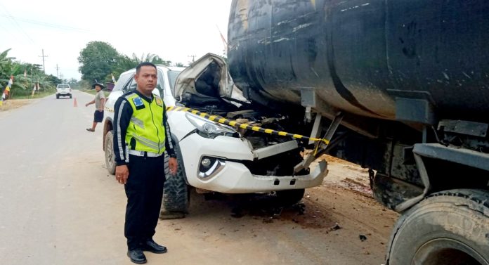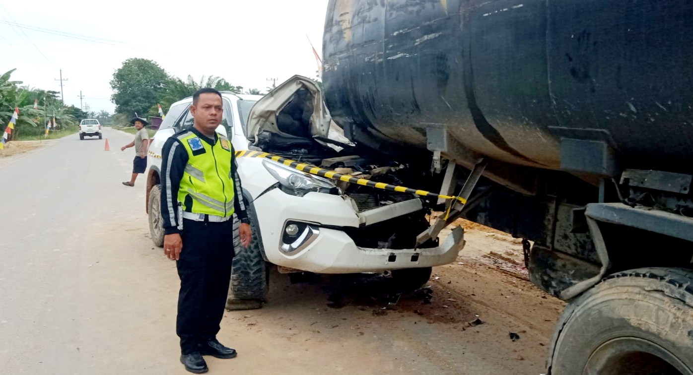 “Toyota Fortuner BM 1525 JL menabrak bagian belakang sebelah kanan truk Tangki BM 8147 EO yang di kemudikan MY. Akibat kejadian tersebut, penumpang Fortuner mengalami luka-luka dan di rawat RSUD Mandau serta kedua kendaraan mengalami kerusakan,” tegasnya. (Bres)