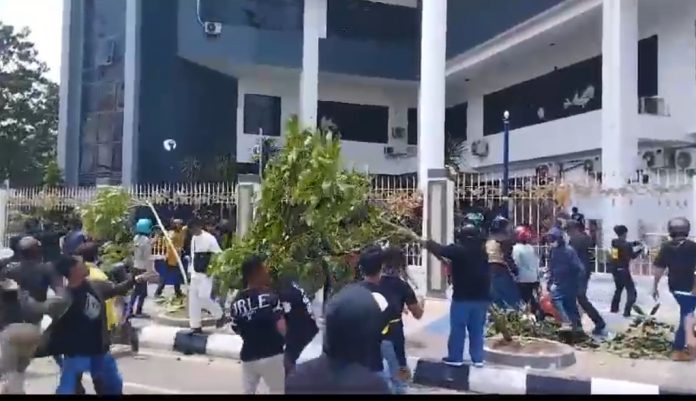 Kericuhan mulai terjadi tatkala massa aksi melemparkan benda-benda ke arah halaman kantor BP Batam, Senin (11/9/2023).