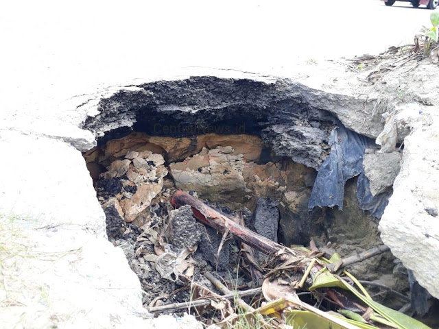 Selain terus meruntuhkan aspal secara perlahan, lanjutnya, ternyata lubang yang ada kian merembes dan menjorok ke lapisan tanah di bawah aspal. Runtuhan-runtuhan tanah kecil sampai dengan berbentuk bongkahan tampak jelas di bawah ruas jalan.