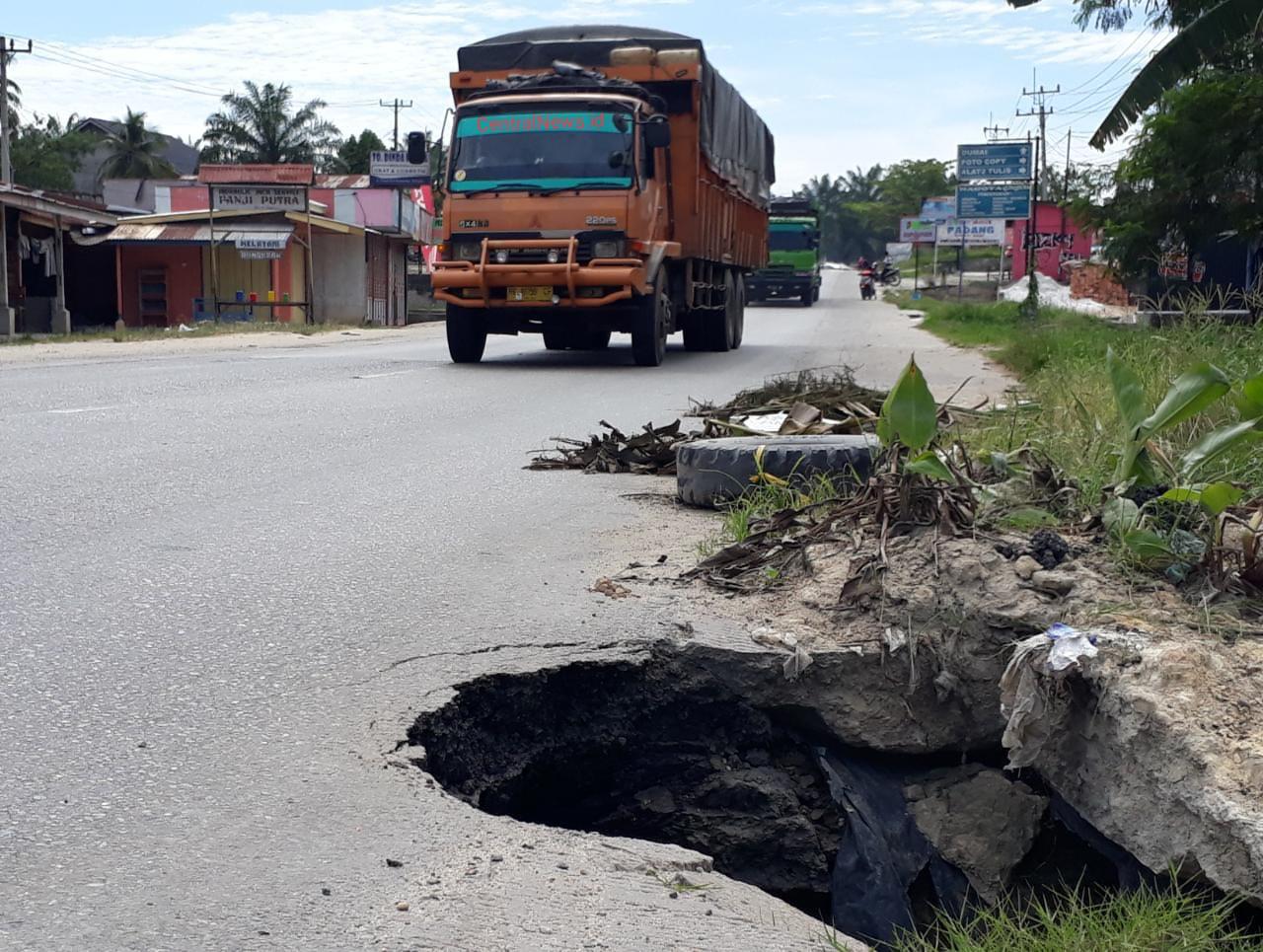 Tak tanggung, kerusakan jalan nasional yang membentang di Kecamatan Bathin Solapan nyaris mewarnai di setiap titiknya.