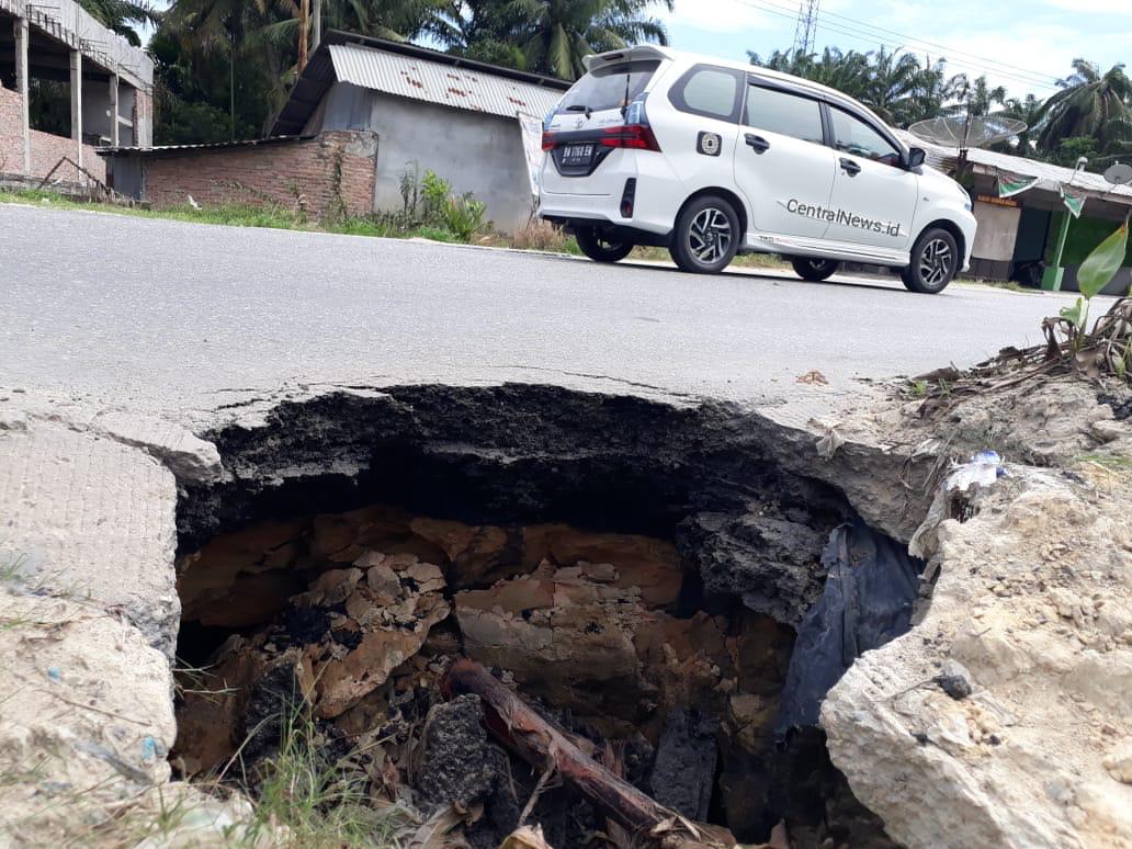 Selain terus meruntuhkan aspal secara perlahan, lanjutnya, ternyata lubang yang ada kian merembes dan menjorok ke lapisan tanah di bawah aspal. Runtuhan-runtuhan tanah kecil sampai dengan berbentuk bongkahan tampak jelas di bawah ruas jalan.